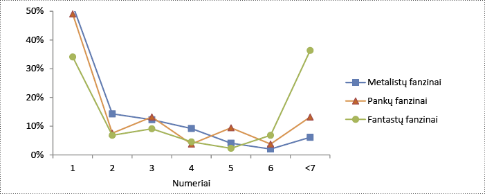 Išanalizavus Skaitmeninio Lietuvos jaunimo kultūros archyvo „Lietuvos zinų kolekcijos“ ir papildomai surinktų šaltinių išteklius, buvo išskirti 195 unikalūs fantastikos gerbėjų, metalistų ir pankų subkultūrai priskirtų vienkartinių ir tęstinių fanzinų pavadinimai, galėję turėti daugiau nei 820 numerių38. Unikalių fanzinų pavadinimų ir jų numerių analizė parodė, kad pankų ir metalistų fanzinų pavadinimų ir jų numerių santykis yra gana panašus (žr. 2 pav.).