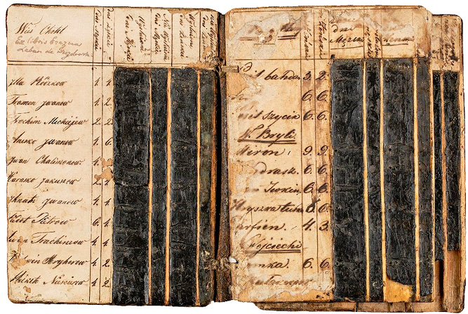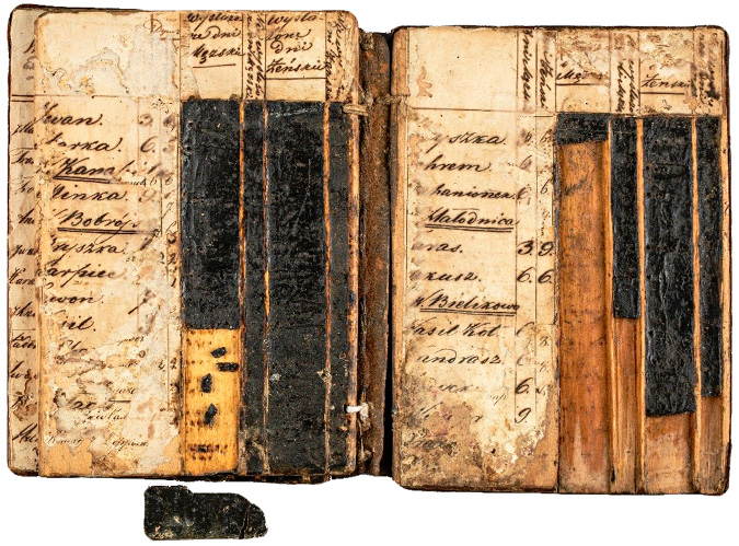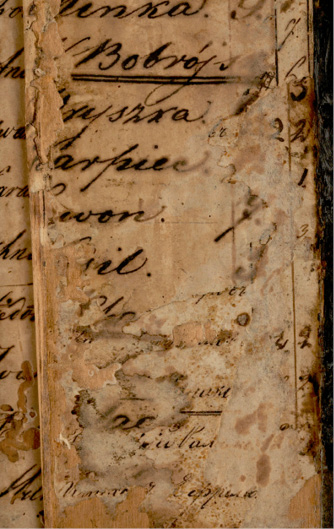 c) Vaškinėse lentelėse vartojama lenkų kalbos ortografija43 neleidžia šio dokumento priskirti ankstesniam nei XIX–XX a. pirmosios pusės laikotarpiui. Tačiau negalima atmesti prielaidos, kad vaškinės lentelės yra senesnio laikotarpio, nes apačioje, po nusitrynusiomis viršutinio popieriaus juostelėmis su įrašais lenkų kalba, matyti senesni popieriaus su įrašais kirilika neįskaitomi fragmentai. Tikėtina, kad lentelės galėjo būti naudojamos ilgesnį laiką, kuomet keitėsi ir vaškinių lentelių savininkai. Tokios prielaidos naudai liudytų pakitusi įrašų kalba, raidynas, rašysena ir kt. Dėl šios priežasties jų datavimas yra komplikuotas ir kol kas negali būti tikslus.