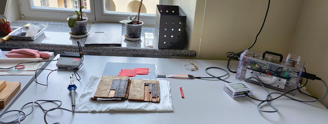 46 Tyrimus atliko Vilniaus universiteto bibliotekos Dokumentinio paveldo išsaugojimo skyriaus restauravimo technologijų specialistė Greta Keraitė ir dokumentų restauratorius Sigitas Tamulis.