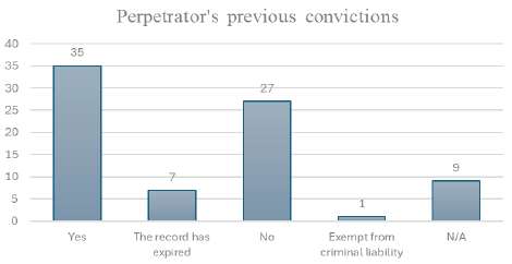 One notable feature highlighted in the analysed publications is the perpetrator’s prior criminal record. This aspect is frequently mentioned in media articles, regardless of whether the individual has a criminal history. Additionally, the nature of the previous offence for which the perpetrator was convicted is not considered or clarified. When analysing criminal case verdicts, it is noticeable that, although a large proportion of defendants have previous convictions, only a relatively small portion of them have previous convictions for a sexual offence. It is also worth noting that a correspondingly high proportion of defendants have no previous convictions, although the media’s emphasis on the defendant’s criminal record gives the impression that the individuals committing these offences are “hardened criminals”. (Table 3)