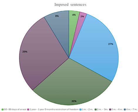 For the other two offences, governed by Articles 149(1) and 150(1) of the Criminal Code, the ranges of imprisonment are identical, with Article 150(1) also allowing for an alternative penalty of arrest. Despite this provision, the alternative penalty is rarely applied. The most common custodial sentences for these offences are 2 and 3 years of imprisonment, with sentences of 4 years being less frequent. While the average sentence for these offences is 3.6 years, a significant proportion of sentences fall below this average. Across all the offences analysed, the average sentence is 3 years and 2 months, with 3 years of imprisonment being the most frequently imposed sentence, lower than the average prescribed by the sanctions.