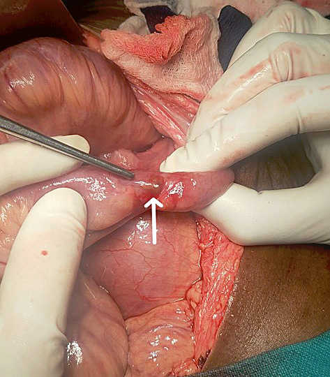 The patient was initially resuscitated with intravenous fluids, nasogastric decompression and antibiotics. Given the history of persistence of symptoms for nearly seven days, the patient was taken up for an emergency exploratory laparotomy.