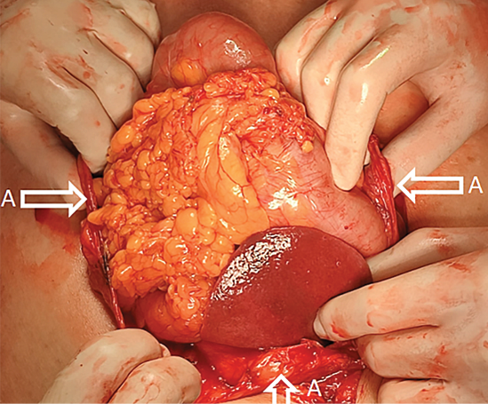 Figure 2. Intraoperative findings during the surgery (A – Hernia sac)