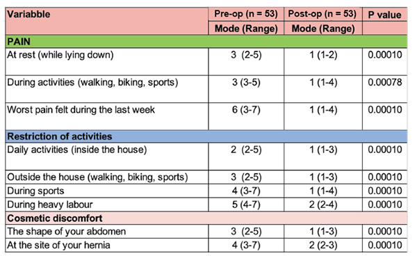 In response to the need for a comprehensive QoL assessment tool tailored to abdominal wall reconstruction (AWR) patients, the European Hernia Society introduced the EuraHS-QoL in 2016. This initiative aimed to address the inadequacies of existing QoL measurement instruments specific to hernia repair outcomes. The EuraHS-QoL score, characterized by its affordability, patient-centric design, and ease of interpretation, presents a viable option for evaluating postoperative QoL outcomes, albeit challenges persist in long-term patient follow-up. Our study leverages this validated tool to analyse outcomes among our cohort of 53 patients, revealing a significant enhancement in QoL metrics postoperatively [6, 7].