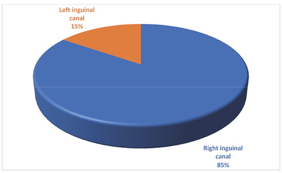 Location and anatomical type of hernias. 22 (84.6%) hernias were present on the right side and 4 (15.4%) on the left side, as depicted in Figure 3. 25 (96.2%) were indirect inguinal hernias, and 19 (73.1%) were irreducible or incarcerated.