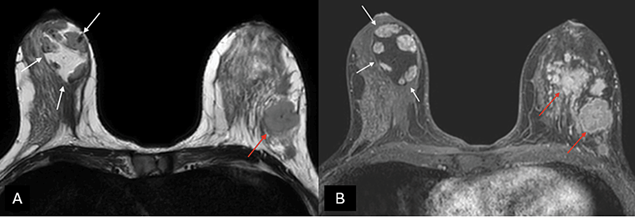 Figure 4. (A) Axial T2-weighted images and (B) T1-weighted fat-suppressed enhanced magnetic resonance imaging (MRI) – a capsulated, large-sized hamartoma can be seen located in the outer quadrants of the right breast, exhibiting a signal identical to normal mammary gland tissue, creating a “breast within a breast” appearance (white arrows). There are multiple masses in the contralateral breast with suspicious morphology, associated with a known invasive ductal carcinoma (red arrows). Image credits: El Yousfi Z, El Mansoury FZ, El Bakkari A, Omor Y, Latib R. Breast hamartoma with synchronous contralateral breast cancer: a case report. Cureus 2024; 16(8): e66534. DOI: 10.7759/cureus.66534. Reused under the terms of the Creative Commons Attribution License CC-BY 4.0. (https://creativecommons.org/licenses/by/4.0/deed.en).