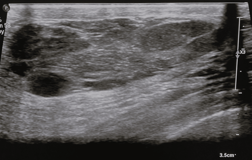 Figure 3. Breast ultrasound – breast ultrasound shows a tissue formation with the long axis parallel to the cutaneous plane, well-circumscribed, heterogeneous, with hypoechoic with hyperechoic trabeculae and posterior acoustic enhancement. Image credits: El Yousfi Z, El Mansoury FZ, El Bakkari A, Omor Y, Latib R. Breast hamartoma with synchronous contralateral breast cancer: a case report. Cureus 2024; 16(8): e66534. DOI: 10.7759/cureus.66534. Reused under the terms of the Creative Commons Attribution License CC-BY 4.0. (https://creativecommons.org/licenses/by/4.0/deed.en).