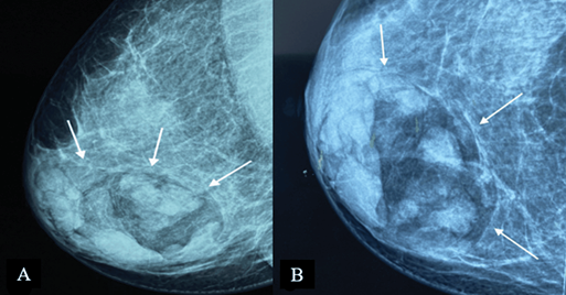 Figure 2. Digital mammography: medio-lateral oblique (A) and cranio-caudal (B) projections of the right breast – a large, well-defined mass containing radiolucent (fat) and radiopaque (soft tissue) densities can be seen. It is surrounded by a thin radiopaque capsule, presenting a “breast within a breast” appearance. Image credits: El Yousfi Z, El Mansoury FZ, El Bakkari A, Omor Y, Latib R. Breast hamartoma with synchronous contralateral breast cancer: a case report. Cureus 2024; 16(8): e66534. DOI: 10.7759/cureus.66534. Reused under the terms of the Creative Commons Attribution License CC-BY 4.0. (https://creativecommons.org/licenses/by/4.0/deed.en).