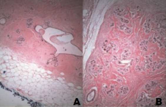 Figure 1 (A) and (B). Well-circumscribed mass with normal terminal ductal lobular unit, fat and hyalinized stroma, Haematoxylin Eosin (H&E), X 640. Image credits: Sevim Y, Kocaay AF, Eker T, Celasin H, Karabork A, Erden E, Genc V. Breast hamartoma: a clinicopathologic analysis of 27 cases and a literature review. Clinics (Sao Paulo) 2014; 69(8): 515–523. DOI: 10.6061/clinics/2014(08)03. Reused under the terms of the Creative Commons Attribution Non-Commercial License (http://creativecommons.org/licenses/by-nc/3.0/).