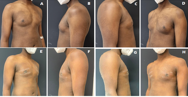 Figure 3. A 26-year-old patient with Grade IIB gynecomastia (A to D – preoperative images, E to H – postoperative images at 2 weeks)