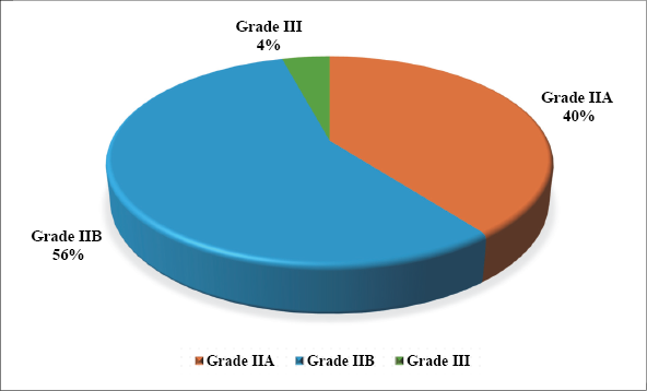 There were 42 (87.5%) cases of bilateral gynecomastia, and in 6 (12.5%) cases, the disease was unilateral, making a total of 90 breasts. Most cases were asymptomatic (n = 41, 85.4%), and only 7 cases (14.6%) had associated pain/tenderness. Psychological impact manifested as anxiety, depression, and/or low self-esteem was reported in 19 (39.6%) cases. One patient (2.1%) had unilateral testicular agenesis, and one more patient (2.1%) had undergone prostatectomy for carcinoma of the prostate. None of the patients belonged to Grade I; 19 (39.6%), 27 (56.2%), and 2 (4.2%) had Grade IIA, Grade IIB, and Grade III gynecomastia, respectively, as depicted in Figure 2.