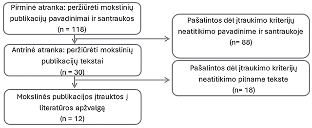 Atlikus paiešką ir atmetus ne viso teksto ir senesnes negu 2014 m. mokslines publikacijas, parašytas ne anglų kalba, atrinkta 118 straipsnių. Toliau straipsniai buvo atrenkami remiantis straipsnių įtraukimo ir atmetimo kriterijais (žr. 2 lentelę).