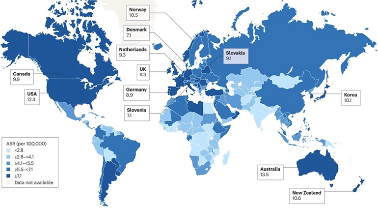 1 pav. 2020 m. jaunų žmonių sergamumas kolorektaliniu vėžiu, standartizuotas pagal amžių (jaunų žmonių kolorektalinis vėžys; amžius – 20–49 m.) abiejų lyčių atstovams visame pasaulyje [1]