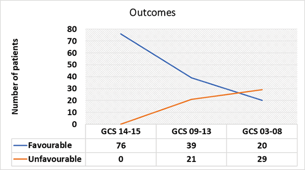 Outcomes. Outcomes as defined by GOS were favourable (GOS 3–5) in 135 (73%) cases and unfavourable (GOS 1, 2) in 50 (27%) cases. The outcomes had a statistically significant relationship (p < 0.05) with the GCS score of the patients at presentation in emergency and steadily deteriorated as the GCS decreased (Figure 2). Similarly, the outcomes were unfavourable in a greater number of patients admitted after road traffic accidents as compared to falls, machinery injuries, or assaults (p < 0.05).