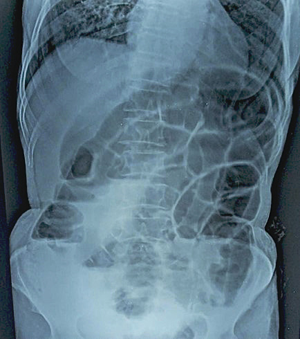 On examination, she was conscious, oriented and emaciated, weighing 37 kg (BMI: 15 kg/m²). Her vitals were unremarkable except the presence of tachycardia (pulse: 108/min). Abdominal examination revealed distension (diameter: 68 cm), periumbilical tenderness, no palpable lump and exaggerated bowel sounds. Digital rectal examination revealed glove stained with liquid stool and no growth.