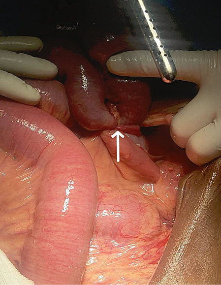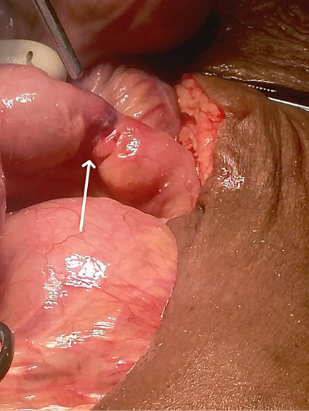 Intraoperatively, proximal small bowel loops were dilated with an anomalous right-sided fallopian tube compressing the distal ileum approximately 7 cm from the ileocecal junction (Figure 3), forming a transition point (Figure 4). The ileal segment was thinned out with impending perforation (Figure 5). Right salpingectomy was done to relieve the obstruction. Dilated proximal bowel loops were decompressed and diversion ileostomy was made from the thinned out segment with a distal mucous fistula.