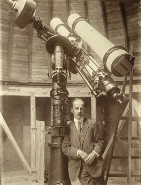 Observatorijos vadovas Wł. Dziewulskis prie ,,Carl Zeiss“ refraktoriaus su astrokamera, įmontuoto mediniame paviljone XX a. trečiame dešimtmetyje, in: PAN, Materiałów Władysława Dziewulskiego, III-146, jednostka 43.
