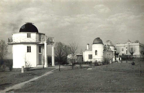 Observatorijos komplekso pastatai XX a. ketvirtame dešimtmetyje. Iš kairės: paviljonas, meridianinis namukas, paviljonas su dviem bokšteliais, astronomų ir meteorologų namas, in: Polska Akademia Nauk Archiwum w Warszawie (toliau – PAN), Materiałów Władysława Dziewulskiego, III-146, jednostka 43.