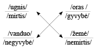 5 Priminsime, kad figūratyvūs universumai būna individualių verčių, t. y. paremti /gyvybės/–/mirties/ priešprieša, ar kolektyviniai (/gamtos/–/kultūros/ priešprieša). Šiame tyrime mus domins individualių verčių universumai.