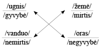 5 Priminsime, kad figūratyvūs universumai būna individualių verčių, t. y. paremti /gyvybės/–/mirties/ priešprieša, ar kolektyviniai (/gamtos/–/kultūros/ priešprieša). Šiame tyrime mus domins individualių verčių universumai.