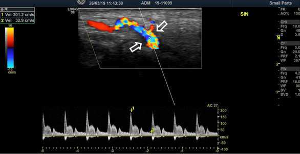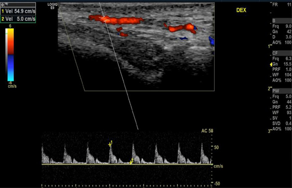 Five years later, at the follow-up visit, the patient did not feel any pain or discomfort in the temporal area bilaterally. No inflammatory signs of temporal arteries were detected (Fig. 3). The control color-coded duplex sonography showed no halo sign, and normal blood flow velocities were registered (Fig. 4). It was concluded that there were no clinical or ultrasound signs of temporal vasculitis.