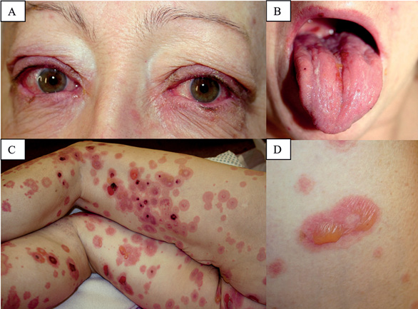 Simptomai atsiranda per 4–28 dienas nuo vaistų vartojimo pradžios [13]. Pirmiausia būna prodromas: karščiavimas, silpnumas ir artralgijos, gerklės perštėjimas, akių gleivinės paraudimas [17, 19, 21]. Laboratoriniais tyrimais aptinkama citopenija, didėjantys kepenų ir inkstų pažeidimo rodikliai [20, 21]. Atsiranda skausminga eritema ir erozijos burnos, akių, genitalijų gleivinėse. Burnos gleivinėje erozijos pasidengia pilkšvai gelsva apnaša, lūpos – kraujingu šašu [18, 20, 23]. Kūno odoje bėrimai iš liemens greitai išplinta į veidą, kaklą, distalines galūnes. Nedidelės dėmelės tampa ryškiai raudonos ar net melsvos, primena „taikinius“, padidėja, vėliau susilieja, ant jų atsiranda didelių plokščių pūslių (2 pav.) [19, 20, 23]. Kadangi SDS/TEN atveju pūslės yra subepiderminės, klinikinio ištyrimo metu būdingas teigiamas Pseudo-Nikolskio simptomas (dar vadinamas epidermio nusilupimo ženklu), kai vos patempus ar patrynus paraudusią odą epidermis nusilupa. Pseudo-Nikolskio simptomas yra sukeltas epidermio ląstelių nekrozės, kitaip nei kliniškai identiškai atrodantis Nikolskio ženklas, sukeltas ląstelių akantolizės sergant pūslinėmis odos ligomis [21, 24]. Esant dideliam pažeidimo plotui dėl gausaus skysčių ir baltymų praradimo atsiranda hemodinamikos sutrikimai, padidėja antrinės infekcijos rizika [21, 25]. Tai yra sunki būklė, kuri progresuoja iki pavojingų komplikacijų. Mirtingumas, dažniausiai – dėl sepsio, SDS metu siekia iki 10 proc., o esant TEN net iki 35 proc. [20, 21].
