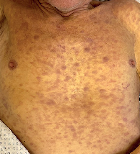 Makulopapulinis bėrimas – dažniausiai pasitaikanti odos reakcija į LTG, įprastai atsirandanti praėjus 4–14 dienų nuo vaisto vartojimo pradžios [13]. Matyti rausvai raudonos dėmės ir papulės, kurios gali susilieti į plokšteles (apvalias ar taikinio formos) (1 pav.) [14, 16]. Dažniausiai bėrimas yra generalizuotas (išplinta kūno, rankų, kojų, rečiau veido srityje), dėstosi simetriškai. Kojose ir pėdose galimas purpuros vaizdas. Tipiškai bėrimų gleivinėse nebūna. Bėrimai gali niežėti, tačiau subjektyvių simptomų gali ir nebūti [14, 17]. Įprastai, nutraukus vaisto vartojimą, makulopapulinis bėrimas išnyksta per savaitę, nepalikdamas randinių ar hiperpigmentinių odos pokyčių. Vis dėlto, toliau vartojant vaistą, bėrimas gali progresuoti iki SDS/TEN [14, 16, 17].