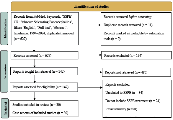 The review includes patients diagnosed with Subacute Sclerosing Panencephalitis (SSPE) and considers studies which clearly describe SSPE treatment regimens and specify the stage of SSPE before treatment initiation, as well as the treatment outcomes. A comprehensive search was conducted by using PubMed. The search was performed on March 1, 2024. The filters included ‘English’, ‘Full text’, and ‘Abstract’, with a publication time frame from 1994 to 2024. The strategy ensured the inclusion of a wide range of relevant studies. A PRISMA flow chart illustrates the selection process (Figure 1).