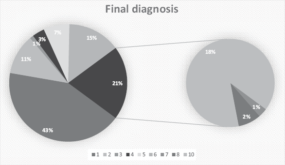 After performing NCS or NCS with electromyography, the diagnosis was specified for 243 (82.1%) patients, whereas, for 53 (17.9%) patients, no clinically significant changes in the nerve conduction study or myography were determined. The most common diagnosis after consultation was carpal tunnel syndrome (42.6%), followed by pathologies of nerve roots or plexuses (14.5%). Other diagnoses made after electrophysiological evaluation are represented in Fig. 2.