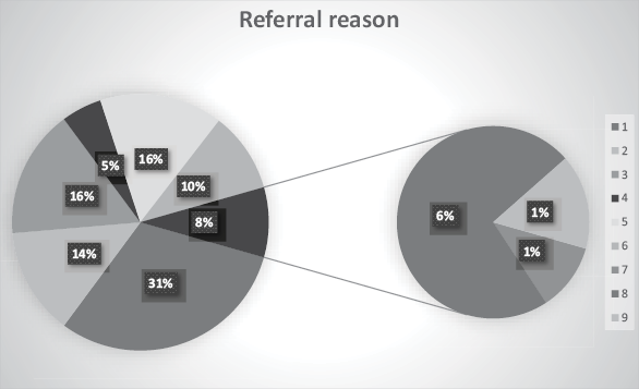 The most common reasons the patients were referred to perform nerve conduction studies (NCS) were the suspected carpal tunnel syndrome (30.7%), cubital tunnel syndrome (13.5%), other upper extremity mononeuropathies (16.2%), and polyneuropathies (15.5%); other groups of referral reasons are presented in Fig. 1.