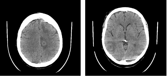 In November 2023, a 55-year-old female patient was hospitalized following a fall at home which resulted in a left elbow fracture. The patient had been feeling dizzy before the incident, prompting a head CT to exclude a head trauma and determine the cause of the dizziness. The CT revealed multiple brain lesions, with differential diagnoses including metastases and abscesses (Fig. 1), necessitating further evaluation via magnetic resonance imaging (MRI). The patient’s medical history indicates that she had been diagnosed with seropositive myasthenia gravis in July 2015. The diagnosis was confirmed by the presence of positive antibodies against acetylcholine receptors (AChR), and a muscle biopsy was performed. The patient was taking Mestinon 60mg x 3, Prednisolone 5mg x 1, and Azathioprine 50mg x 2 for treatment. Plasmapheresis was used to treat exacerbations of myasthenia gravis.