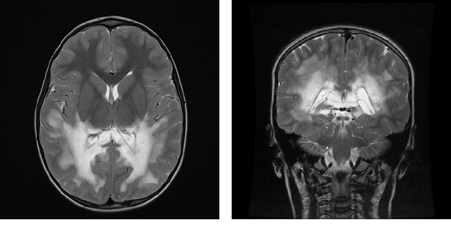 A 7-year-3-month-old boy was hospitalised due to changes in behaviour, episodic strabismus, hearing impairment, and gait difficulties. The parents reported noticing outbursts of anger, increased arguing, the patient was not responding when called from another room, later did not answer the questions and spoke about unrelated topics. The symptoms evolved over 2–3 months (Figure 1). Before the illness, the patient’s psychomotor development was within the normal range, the patient was born from a normal pregnancy and delivery. A family history examination revealed that the patient’s maternal grandmother has been examined for spastic paraparesis, suspected of a demyelination disease, however, the diagnosis was not established.