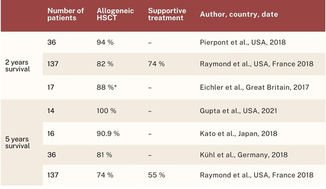 Allogeneic HSCT is the primary and specific early treatment method for X-ALD, slowing down the demyelination progress [14, 15, 31]. The results of 2 and 5-year survival after the procedure are presented in Table 2. Neurological function was better among low-risk (Loes score 0–4.5) patients in comparison to standard-risk patients (Loes score 4.5–9) patients: low-risk patients’ neurocognitive abilities almost reached the normal range, whereas standard-risk patients’ group showed results which were 1 standard deviation lower than the norm [37]. Therefore, early undergoing allogeneic HSCT is related to the preservation of the neurological function and a better quality of life.
