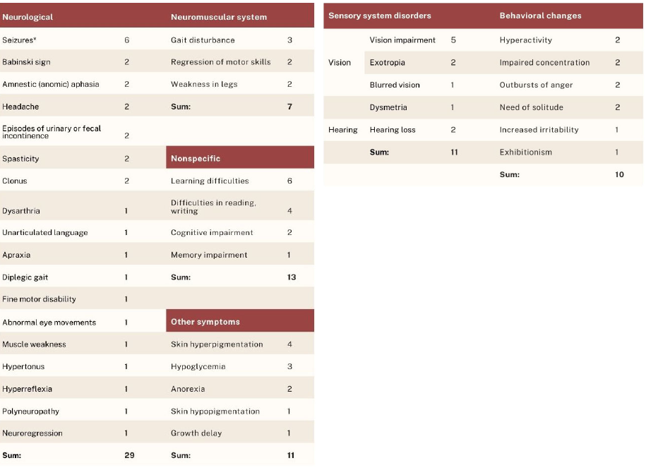 X-ALD case reports available in the PubMed database were examined to compare this clinical case. The research revealed that the first symptoms typically manifest for boys at around 7.64 years (standard deviation ± 2.64 years). The symptoms were categorised into six main groups: behavioural changes, sensory system disorders, neuromuscular system disorders, central nervous system (CNS) impairment, nonspecific, and other symptoms not related to the nervous system. The variety and frequency of the symptoms are presented in Table 1. It is noteworthy that seizures occur in an advanced stage of X-ALD; therefore, despite their frequency, this symptom is not suitable for early diagnosis. Among metabolic disorders causing primary adrenal insufficiency (PAI), X-ALD is the second most common reason [31].