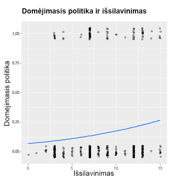 Tačiau norint domėtis politika ir joje dalyvauti, reikia ne tik pinigų, bet ir nematerialių – žinių, gebėjimų ir su tuo susijusių – išteklių, kurie priklauso nuo asmens išsilavinimo. Būtent geriau išsilavinusieji labiau pasitiki savo žiniomis ir gebėjimais ir yra linkę domėtis politika bei joje dalyvauti, pasižymi didesniu politiniu išprusimu20. Taigi, didesnis jauno žmogaus išsilavinimas turėtų lemti didesnius nematerialius išteklius ir todėl aukštesnį domėjimosi politika lygį.
