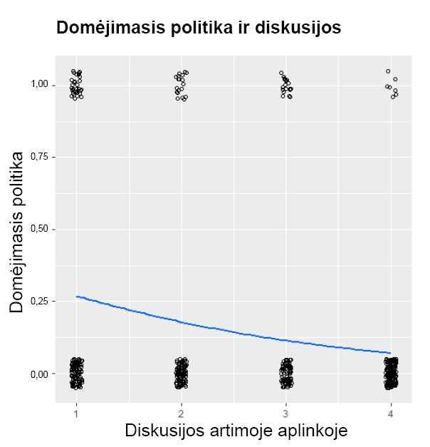 O štai išsilavinimas ir diskusijos įgyja statistiškai reikšmingus regresijos koeficientus bei reikšmingą chi kvadrato reikšmę. Todėl šie kintamieji leidžia prognozuoti, kaip kinta tikimybė domėtis politika besikeičiant išsilavinimui. Išsilavinimo eksponentė β, kuri įgyja didesnę nei 1 reikšmę, rodo, kad, didėjant išsilavinimui per vieną rangą, galimybė, jog asmuo domėsis politika, padidėja 1,11 karto arba, kitaip tariant, didžiausią išsilavinimą įgiję jaunuoliai, palyginti su viena pakopa žemiau už juos esančiais, bus vidutiniškai 11 proc. labiau linkę domėtis politika37. Diskusijų artimoje aplinkoje atveju eksponentė β įgyja reikšmę, mažesnę negu 1, o tai reiškia, kad, didėjant nepriklausomajam kintamajam, galimybė domėtis politika mažėja. Pavyzdžiui, apie politiką nediskutuojančių jaunų žmonių galimybė domėtis politika yra mažesnė 0,59 karto, palyginti su tais, kurie tai daro bent retkarčiais. Taigi tai rodo, jog didesnis išsilavinimas ir dažnesnės diskusijos galėtų padidinti jaunimo domėjimąsi politika Lietuvoje.