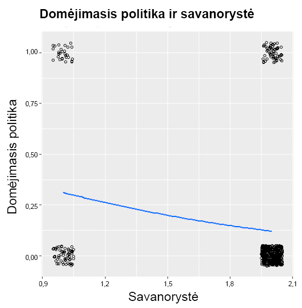 Socioekonominiai veiksniai – pajamos ir subjektyvus gerovės vertinimas – nepasižymi statistiškai reikšmingais regresijos koeficientais (p reikšmė 0,89 ir 0,87). Tą patį galima pasakyti ir apie chi kvadrato reikšmę (p = 0,98). Todėl tikimybė domėtis politika keičiantis pajamoms beveik nesikeičia. Tai rodo ir eksponentė β, kuri beveik lygi 1 – kintant nepriklausomajam kintamajam, priklausomasis iš esmės lieka toks pats.