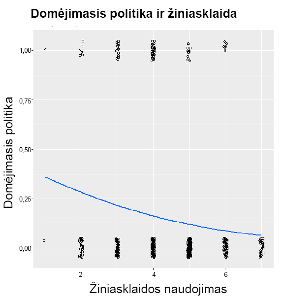 tikimybė, jog priklausomasis kintamasis įgis reikšmę 1 (domėsis politika). Siekiant nustatyti kiekvieno nepriklausomojo kintamojo įtaką, bus skaičiuojama eksponentė β, dar vadinama galimybių santykiu (angl. odds ratio), parodanti, kiek keičiasi priklausomojo kintamojo galimybė įgauti reikšmę 1 (šiuo atveju – kad asmuo domėsis politika), padidėjus nepriklausomajam kintamajam vienu vienetu. Jei eksponentė įgyja mažesnę negu 1 reikšmę, vadinasi, didėjant nepriklausomajam kintamajam, galimybės, jog individas domėsis politika, mažės, o jei eksponentė didesnė negu 1 – galimybės didės. Jei ji lygi 1 – keičiantis nepriklausomojo kintamojo reikšmėms, priklausomasis kintamasis nesikeičia35. Kintamųjų reikšmingumui ir modelio tinkamumui įvertinti naudojami: χ2 (chi kvadrato) statistika, parodanti, kiek modelis gerai prognozuoja, palyginti su baziniu modeliu; klasifikacinė lentelė, skirta nustatyti, kiek modelis gerai prognozuoja priklausomojo kintamojo reikšmes; Nagelkerkeʼės r2 determinacijos koeficientas, leidžiantis spręsti apie bendrą modelio tinkamumą (koeficientas įgyja reikšmę nuo 0 iki 1 ir kuo arčiau 1, tuo tinkamesnis, tačiau tam, kad modelis būtų tinkamas iš esmės, koeficientas neturėtų būti mažesnis kaip 0,2)36.