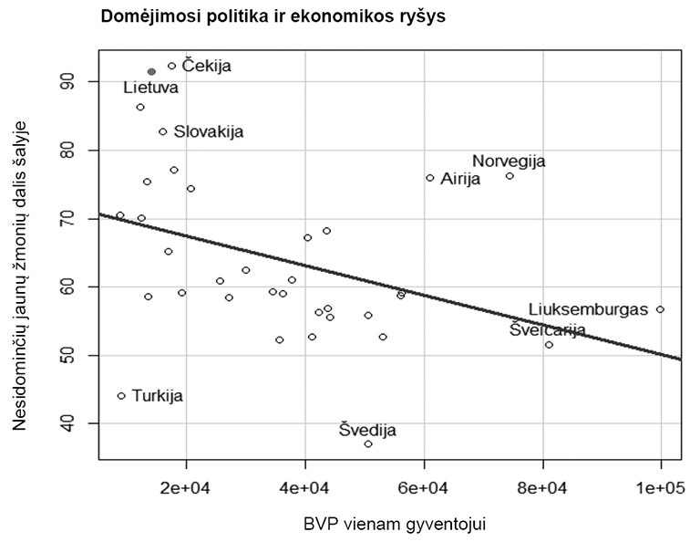 Iš visų grafikų matyti, kad Lietuva išsiskiria iš bendros tendencijos: ekonomikos, žiniasklaidos naudojimo, pasitikėjimo valdžia ir politinių diskusijų modeliai visur prognozuotų mažesnį Lietuvos jaunimo nesidomėjimą politika. Lietuva ypač išsiskiria žiniasklaidos naudojimo (naudojimas palyginti dažnesnis, bet domėjimasis mažas) bei pasitikėjimo valdžia (pasitikima vidutiniškai, bet nesidomima itin stipriai) kintamųjų atžvilgiu. Todėl šių veiksnių bendrai įtakai ir aiškinamajai galiai nustatyti papildomai sudaromas tiesinės regresijos modelis, kuriame analizuojama, kaip nesidominčių politika jaunų žmonių dalį šalyje lemia ekonomika, pasitikėjimas valdžia, diskusijos ir žiniasklaidos naudojimas. Sudėjus visus keturis nepriklausomuosius kintamuosius, modelio R2 įgyja reikšmę 0,48, tad bendrai modelis pakankamai neblogai prognozuoja priklausomąjį kintamąjį. Tiesa, nė vienas koeficientas nėra statistiškai reikšmingas, tačiau taip gali nutikti dėl to, kad atvejų skaičius sumažėja iki 19 (vienas iš kintamųjų – diskusijos – įgyja reikšmes tik Europos šalyse). Dėl to regresijos modelis sudaromas be diskusijų kintamojo – jo R2 sumažėja iki 0,3, o statistiškai reikšmingų koeficientų (p < 0,05) vis dar nėra. Galiausiai pabandžius iš modelio pašalinti pasitikėjimo valdžia kintamąjį, vienas iš kintamųjų – žiniasklaidos naudojimas – įgauna statistiškai reikšmingą koeficientą, o modelio R2 padidėja iki 0,4896, tad pakankamai gerai atspėja priklausomąjį kintamąjį (žr. 3 lentelę).