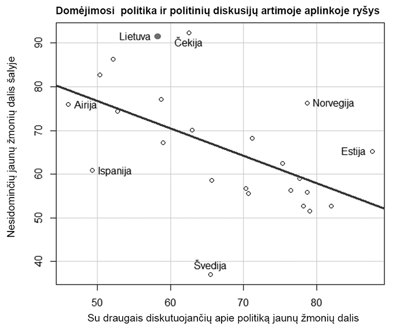 Du socializaciniai veiksniai – politinės diskusijos artimoje aplinkoje ir žiniasklaidos naudojimas – taip pat pasižymi statistiškai reikšmingais ryšiais. Didėjant diskutuojančių apie politiką su draugais jaunų žmonių daliai, mažėja nesidominčių politika skaičius šalyje. Tačiau Lietuva (kaip ir Čekija) vėl nevisiškai atitinka modelį – pagal diskutuojančių su draugais apie politiką jaunų žmonių dalį domėjimasis politika turėtų būti kur kas didesnis. Mažėjant jaunų žmonių vidutiniškam žiniasklaidos priemonių naudojimui sužinoti viešojo gyvenimo naujienoms (kuo nepriklausomo kintamojo reikšmė didesnė, tuo rečiau naudojamos žiniasklaidos priemonės), didėja ir nesidominčių politika jaunų žmonių dalis šalyje. Lietuva aiškiai išsiskiria – pasižymi palyginti dažnesniu vidutinišku jaunų žmonių žiniasklaidos naudojimo rodikliu, tačiau itin dideliu nesidomėjimu politika. Be to, šiame koreliacijos grafike Lietuva, skirtingai nei ankstesniuose grafikuose, nutolsta nuo Čekijos, Vengrijos ir Slovakijos, kurios pasižymi kur kas retesniu žiniasklaidos naudojimu.