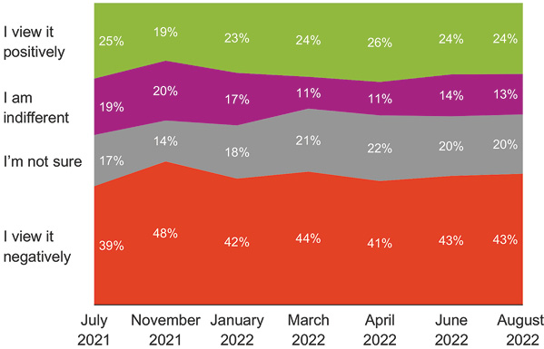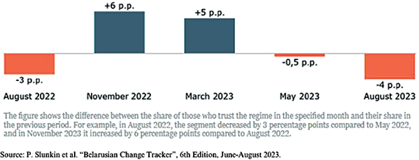 However, the 6th edition of the Belarusian Change tracker recorded fluctuations in these sentiments from August 2022 to August 2023, with an increase in the trust of the government until March 2023, and again a slight decrease from May to August 2023, as shown in Figure 5. Nevertheless, as reported by the authors, the last decrease is currently statistically insignificant to be considered as the beginning of a new downward trend.69
