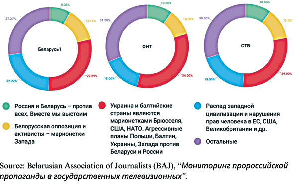 Belarus has historically maintained close ties with Russia in the realm of information and media as well. One primary factor contributing to this situation is that journalists in Belarus frequently encounter difficulties in expressing personal opinions or presenting content that deviates from the choices of the regime. It is not by chance that Belarus ranks 0/4 in the “Freedom in the World 2023” report and has been labelled as Europe’s “most dangerous country for journalists.”98 As outlined in Amnesty International’s 2022/23 report, numerous individuals have indeed faced legal action for expressing support for Ukraine, reporting on Russian troops movements, and criticising the government,99 while authorities have persisted in arbitrarily labelling organisations, online resources, printed materials, and other content as ”extremist.”100 The absence of media freedom, the escalating repression occurring since 2021, and the recent amendments to the 2008 Law “On Mass Media,”101 which broadens the grounds for blocking foreign and local news websites and aggregators, creates an environment where those providing information are compelled to align with the regime’s ideology. This, in turn, allows for Russian media and Russian propaganda messages to proliferate in Belarus, influencing and moulding the knowledge and perceptions of Belarusian citizens. Indeed, Russian television channels, radio stations, and printed newspapers, such as Komsomolskaya Pravda and Argumenty i Fakty, are widely accessible and consumed by the Belarusian population.102 The Belarusian Association of Journalists (BAJ) undertook an analysis of the main Belarusian television channels spanning from 2018 to 2020. The findings disclosed not only the greater influence of Russian television programs over their domestic counterparts but also identified recurrent instances of incorporating elements of pro-Russian and pro-integration propaganda, as depicted in Figure 7. In fact, numerous Russian media outlets or Belarusian platforms reproduce Russian information and endorse narratives akin to those outlined in Komsomolskaya Pravda and the Sputnik news agency, which are both linked to Russia and in 2018 resulted among the top 20 Belarusian media sites.103 Moreover, four out of nine regularly broadcasted TV channels in Belarus heavily rely on Russian TV production, airing over 60% of Russian-made TV programs.104 This mirroring has only worsened after 2022 and Russia’s invasion of Ukraine, with Belarus copying and synchronising its state propaganda with Russian narratives, especially regarding the Ukrainian conflict. Some examples are that Russia’s actions against Ukraine are a necessary self-defence, and that the Russian army is liberating Ukrainian cities.105As of the current writing, these narratives persistently endure. Notably, Isans’ monthly review #3 of Belarus propaganda in December 2023 highlights influential messages emphasising the celebration of the “Union State” anniversary, Lukashenka’s positive image, of his international engagements and role as a mediator with Ukraine, as well as the deployment of Russian tactical nuclear weapons and anti-West, anti-Polish campaigns.106 Overall, the combination of a low degree of decision-making in foreign policy, the high level of dependence on economic subsidies, and the significant presence of Russia in the media and press landscape of Belarus are evidence of Belarus’s challenges in fully being independent from its ally, Russia.