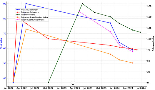 This comparison enabled us to calculate the trust/number valuence index by using the formula V = T x N / 106. On the above-outlined grounds, this index of valuence of Zelenskyy on the Telegram network was: February 2022 (before the Russian invasion) – 37 x 54473 / 106 = 2.0; May 2022 – 90 x 1350000 / 106 = 121.5; December 2023 – 77 x 849000 / 106 = 65.4; February 2024 – 64 x 811000 / 106 = 51.9; May 2024 – 59 x 770335 / 106 = 45.4. The trust/number valuence index of the President of Ukraine on Viber was: May 2023 – 90 x 1800000 / 106 = 162; December 2023 – 77 x 1500000 / 106 = 115.5; February 2024 – 64 x 1350000 / 106 = 86.4; May 2024 – 59 x 1200000 / 106 = 70.8.
