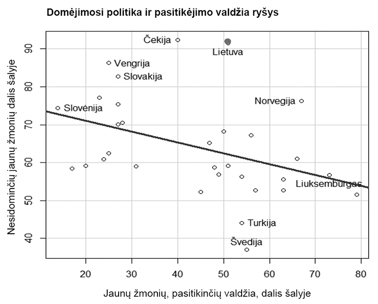 Lietuva šiame kontekste išsiskiria kaip ypatingas atvejis. Jauni žmonės čia pasižymi rekordiškai mažu dalyvavimu rinkimuose (18–35 m. žmonių aktyvumas 2012 m. Seimo rinkimuose buvo vos 18 proc., 2016 m. Seimo rinkimų pirmame ture pakilo iki 37,8 proc., tačiau antrame ture vėl smuko iki 24 proc.), o kitų amžiaus grupių aktyvumas per rinkimus siekia apie 50–60 proc.6 Šie skaičiai gerokai didesni, palyginti su atitinkamais kitų šalių. Pavyzdžiui, Ekonominio bendradarbiavimo ir plėtros organizacijos (EBPO) šalyse šis santykis vidutiniškai atitinka 8:107. EBPO duomenimis, iš šios organizacijos narių ir šalių kandidačių Lietuvoje yra ir daugiausia jaunų žmonių (15–29 m.), teigiančių, kad visiškai nesidomi politika. Tokių jaunų žmonių, kaip paaiškėjo iš EBPO tyrimo, Lietuvoje yra net 60 proc. (dvigubai daugiau nei bendrai tarp visų amžiaus grupių – 30 proc.),