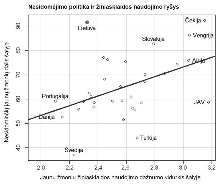 Du socializaciniai veiksniai – politinės diskusijos artimoje aplinkoje ir žiniasklaidos naudojimas – taip pat pasižymi statistiškai reikšmingais ryšiais. Didėjant diskutuojančių apie politiką su draugais jaunų žmonių daliai, mažėja nesidominčių politika skaičius šalyje. Tačiau Lietuva (kaip ir Čekija) vėl nevisiškai atitinka modelį – pagal diskutuojančių su draugais apie politiką jaunų žmonių dalį domėjimasis politika turėtų būti kur kas didesnis. Mažėjant jaunų žmonių vidutiniškam žiniasklaidos priemonių naudojimui sužinoti viešojo gyvenimo naujienoms (kuo nepriklausomo kintamojo reikšmė didesnė, tuo rečiau naudojamos žiniasklaidos priemonės), didėja ir nesidominčių politika jaunų žmonių dalis šalyje. Lietuva aiškiai išsiskiria – pasižymi palyginti dažnesniu vidutinišku jaunų žmonių žiniasklaidos naudojimo rodikliu, tačiau itin dideliu nesidomėjimu politika. Be to, šiame koreliacijos grafike Lietuva, skirtingai nei ankstesniuose grafikuose, nutolsta nuo Čekijos, Vengrijos ir Slovakijos, kurios pasižymi kur kas retesniu žiniasklaidos naudojimu.