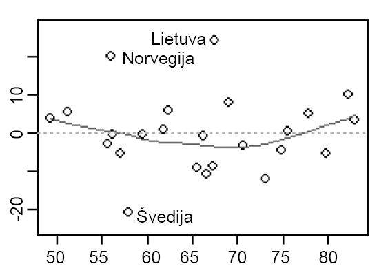 Čia svarbiausia patikrinti, kaip šiam modeliui pavyktų prognozuoti Lietuvos atvejį. Iš 7 pav. matyti, jog modelis prognozuotų, kad Lietuvoje turėtų būti 68 proc. jaunimo nesidomėjimo politika lygis, tad likusių 24 proc. jaunų žmonių Lietuvoje nesidomėjimas politika lieka nepaaiškinamas. Todėl išskirti nepriklausomieji kintamieji, nors gana neblogai prognozuoja EBPO šalių jaunimo domėjimąsi bendrai, neleidžia iki galo paaiškinti Lietuvos atvejo išskirtinumo, nes neatspėja beveik 1/5 priklausomojo kintamojo reikšmių.