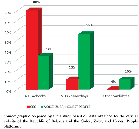 Of particular concern is the respect for fundamental rights which, as per Articles 2 and 21 of the Constitution, represent the state’s highest objective. In fact, especially after 2020, there has been an increase in the violations of rights such as freedom of thought and expression, with thousands being prosecuted and/or being labelled as “extremists.”47 Other rights violations were detected in relation to the electoral process, as Articles 38, 65, 66, and 67 of the Constitution, respectively, outline principles of universal suffrage, equality and free and direct participation. However, the 2020 elections faced multiple complaints regarding the intimidation, harassment and imprisonment of opposition candidates and their supporters.48 Lukashenka’s strategy for retaining power hinges on “the principle of perpetual incumbency, (which means that) the officially announced results are fabricated in order to create the narrative that the majority of the people support the current government.49 In other words, despite the constitutional provisions guaranteeing freedom of choice in the elections, the reality in Belarus often demonstrates that the electoral process is manipulated to favour a specific candidate. This is particularly evident in Figure 2, showing a glaring disparity between the official results released by Belarusian authorities50 and the reports provided by independent platforms like Golos, Zubr, and Honest People.51 According to the Central Election Committee (CEC), Lukashenka was declared the winner with 80.2 % of the vote. However, the independent platforms found proof of falsification at every third polling place, ultimately discovering that Tsikhanouskaya had won with 56%.52 This ongoing strategy is expected to persist and potentially further evolve leading up to the next presidential elections scheduled for 2025. Notably, this strategy has coincided with a decrease in political pluralism within the country. Indeed, the repression started in 2020 and the following mass emigration has resulted in a reduction in the presence of opposition parties, with those remaining being systematically targeted. In the most recent parliamentary elections held in February 2024, only the four pro-governmental parties were allowed to participate, a clear indication of the prevailing political landscape. Additionally, the most recent amendment in the Constitution, enacted in February 2022, plays a crucial role in undermining the de facto authority of Lukashenka. For instance, Article 80 states that presidential eligibility is restricted to individuals who have maintained residence in Belarus for a minimum of 20 years immediately before the elections, and who have not previously held citizenship, or a residence permit issued by a foreign state. This provision effectively disqualifies nearly all current oppositional candidates from running for the presidency. While the amendment directly weakens the opposition, it has also raised concerns about the impact on Lukashenka’s authority and the potential for increased influence from Moscow.53 Notably, Article 85 no longer confers the force of law upon presidential decrees, and Article 89 (1)(3) grants the All-Belarusian People’s Assembly (ABPA) substantial powers, including deciding on the domestic and foreign policy, on the military doctrine, as well as on the removal of the President from office. In this sense, the amendments to the Constitution, particularly those excluding certain candidates from participating in elections, represent a significant erosion of the regime’s de facto authority. As outlined in our theoretical framework, authority entails seeking voluntary compliance through rational persuasion and gentle manipulation. However, by enacting amendments that perpetuate incumbency and limit political competition, the regime under Lukashenka exhibits more coercive power rather than genuine authority. Therefore, these changes not only affect the legal framework but also have tangible implications for the regime’s authority and its ability to govern with legitimacy.