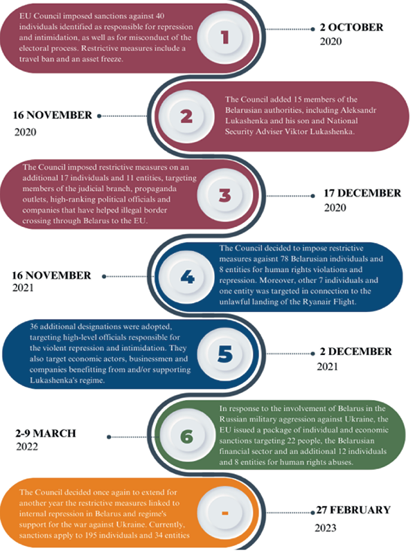 Source: Infographic created by the author based on data provided by the European Council (2023). https://www.consilium.europa.eu/en/policies/sanctions/restrictive-measures-against-belarus/belarus-timeline/