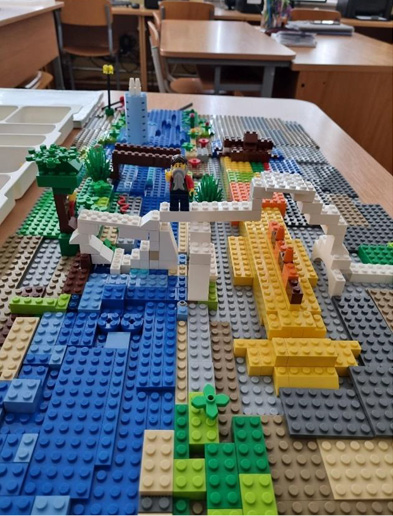 In one of the subjects, specifically, the Lithuanian language and literature, the teacher decided that pupils would have a task “Lego rivers flow and… tell the stories”: in small groups, they would construct any river model and create a story. One group of fifth-grade boys builds a river as home for the great pike (yellow; seen in Figure 7 on the right side).