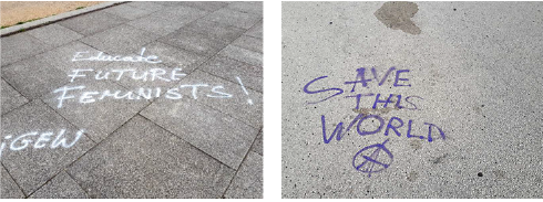 On the one hand, in these urban places, materiality, such as concrete, monuments, or buildings, is transformed by the creative practices having among a group of climate activists. These specific creative practices encompass dancing, singing, sitting, talking, chanting, writing, shouting, and demanding climate justice in these urban places.